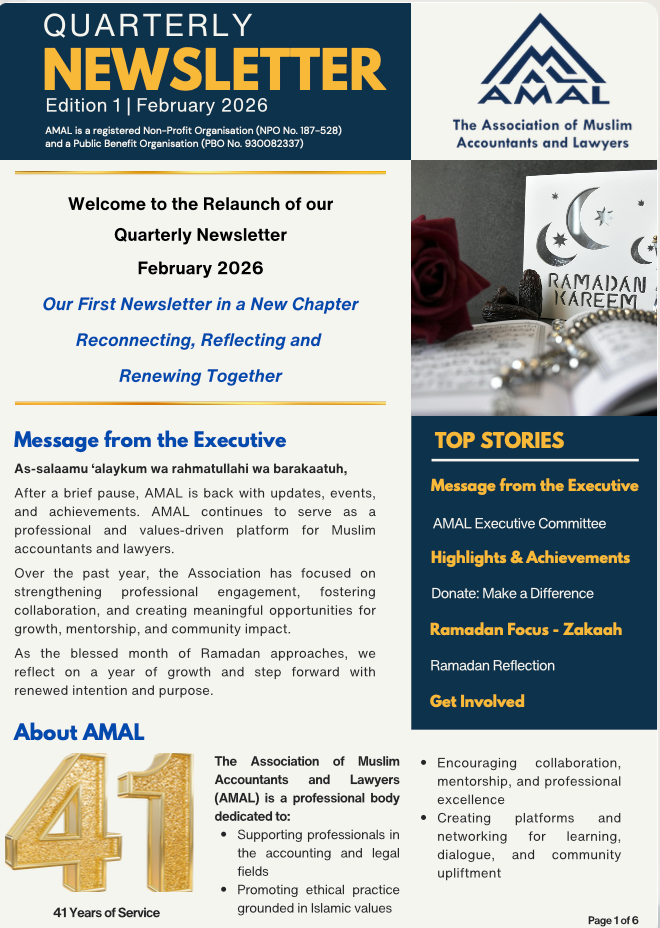 AMAL is a professional organisation, serving South Africa, since 1984, empowering Muslims in the fields of Accounting and Law. Through our dedicatedchapters in, ACCOUNTING, LEGAL, ISLAMIC and ADVOCACY we bring together professionals, fostering collaboration and providing resources for continuous learning, development and empowerment.